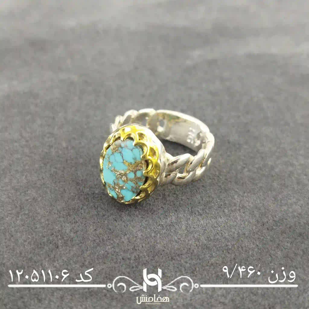 انگشتر نقره مردانه دورنگ فیروزه با سنگ طبیعی اصل و نقره عیار استاندارد 925 تولید شرکت هخامنش میباشد.