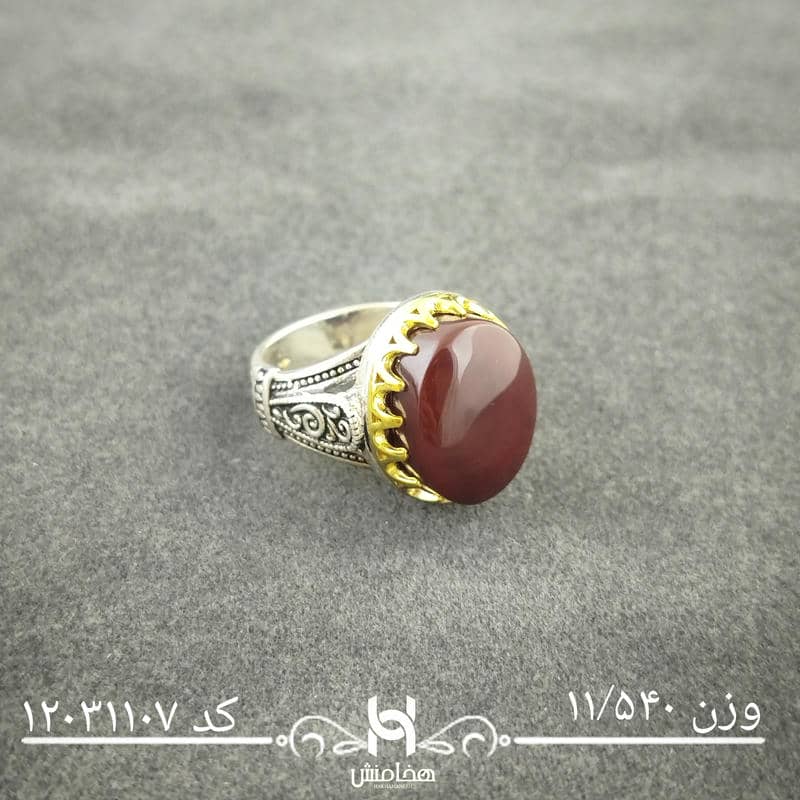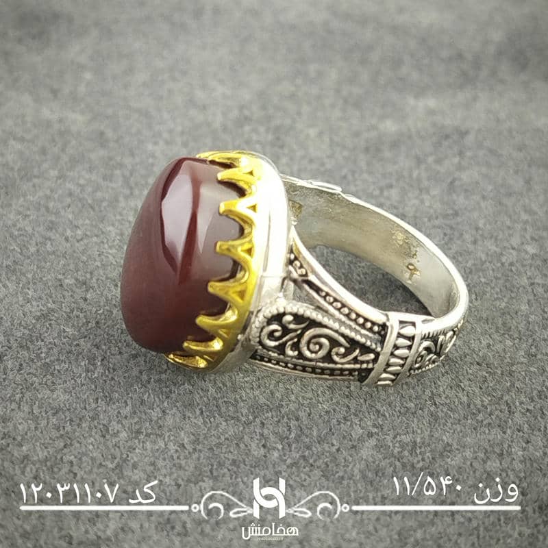 انگشتر نقره مردانه دورنگ عقیق سرخ با سنگ طبیعی اصل و نقره عیار استاندارد 925 تولید شرکت هخامنش میباشد.