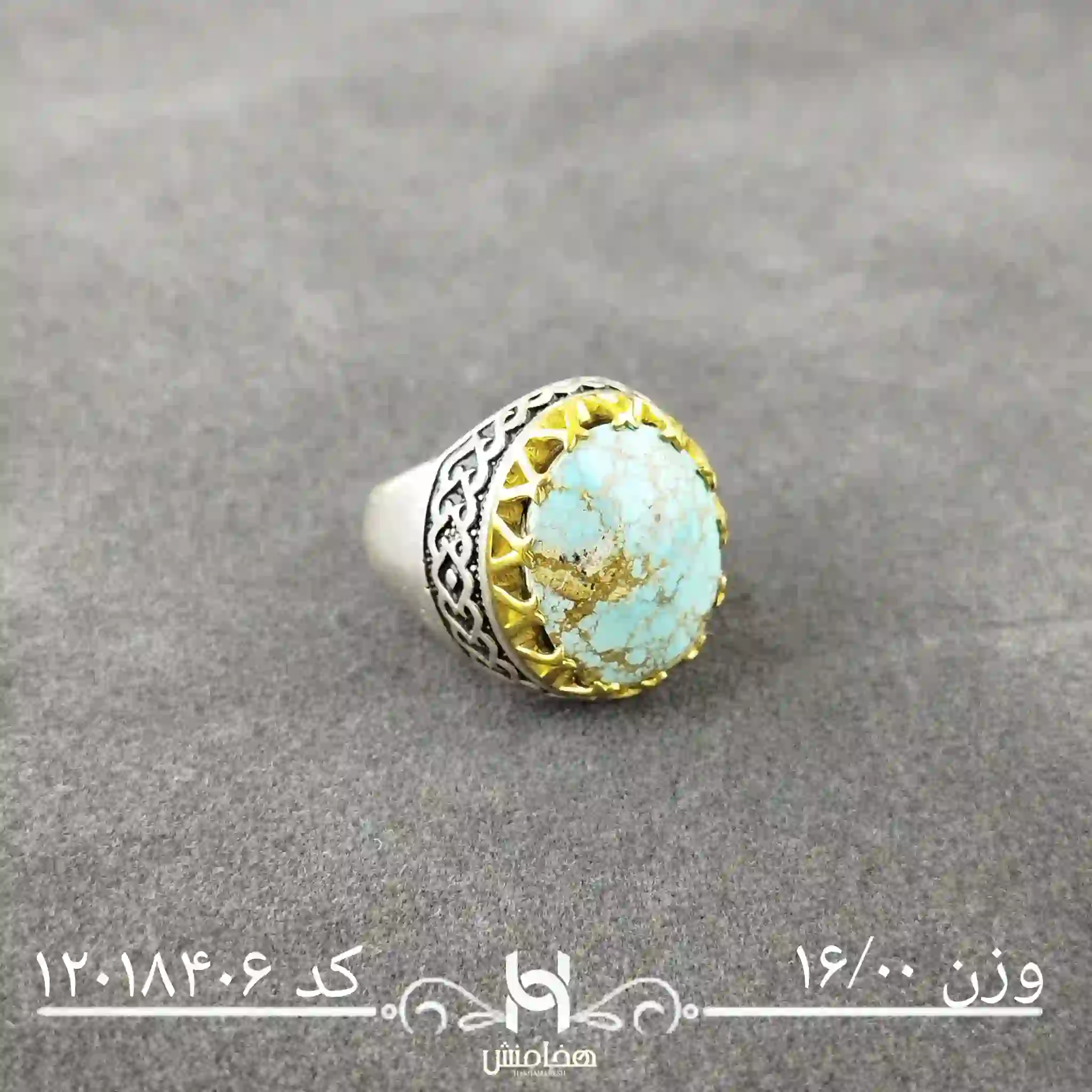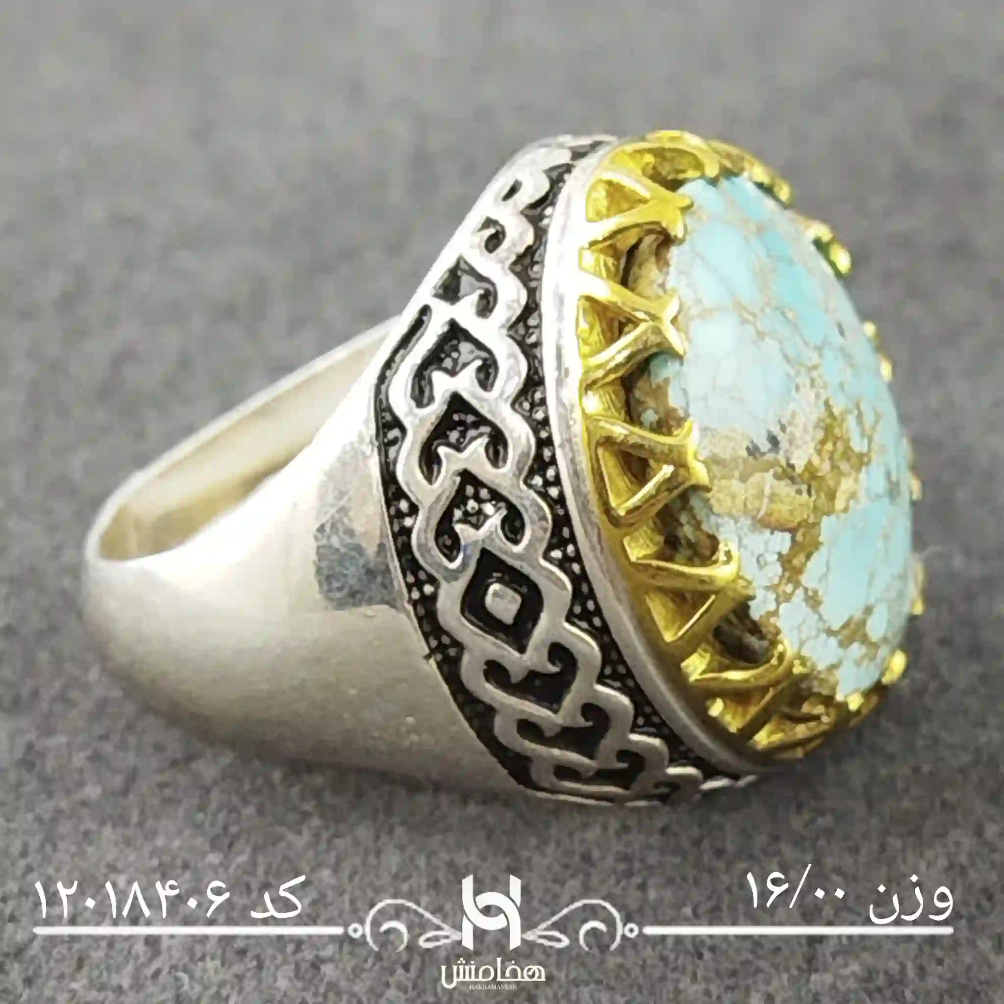 انگشتر نقره مردانه فیروزه دورنگ با سنگ طبیعی اصل و نقره عیار استاندارد 925 تولید شرکت هخامنش میباشد.