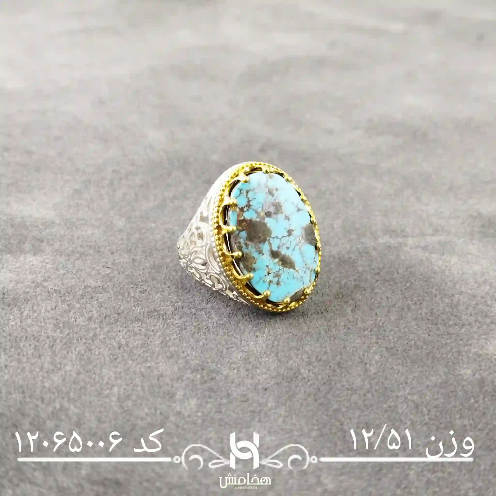 انگشتر نقره مردانه فیروزه دورنگ با سنگ طبیعی اصل و نقره عیار استاندارد 925 تولید شرکت هخامنش میباشد.