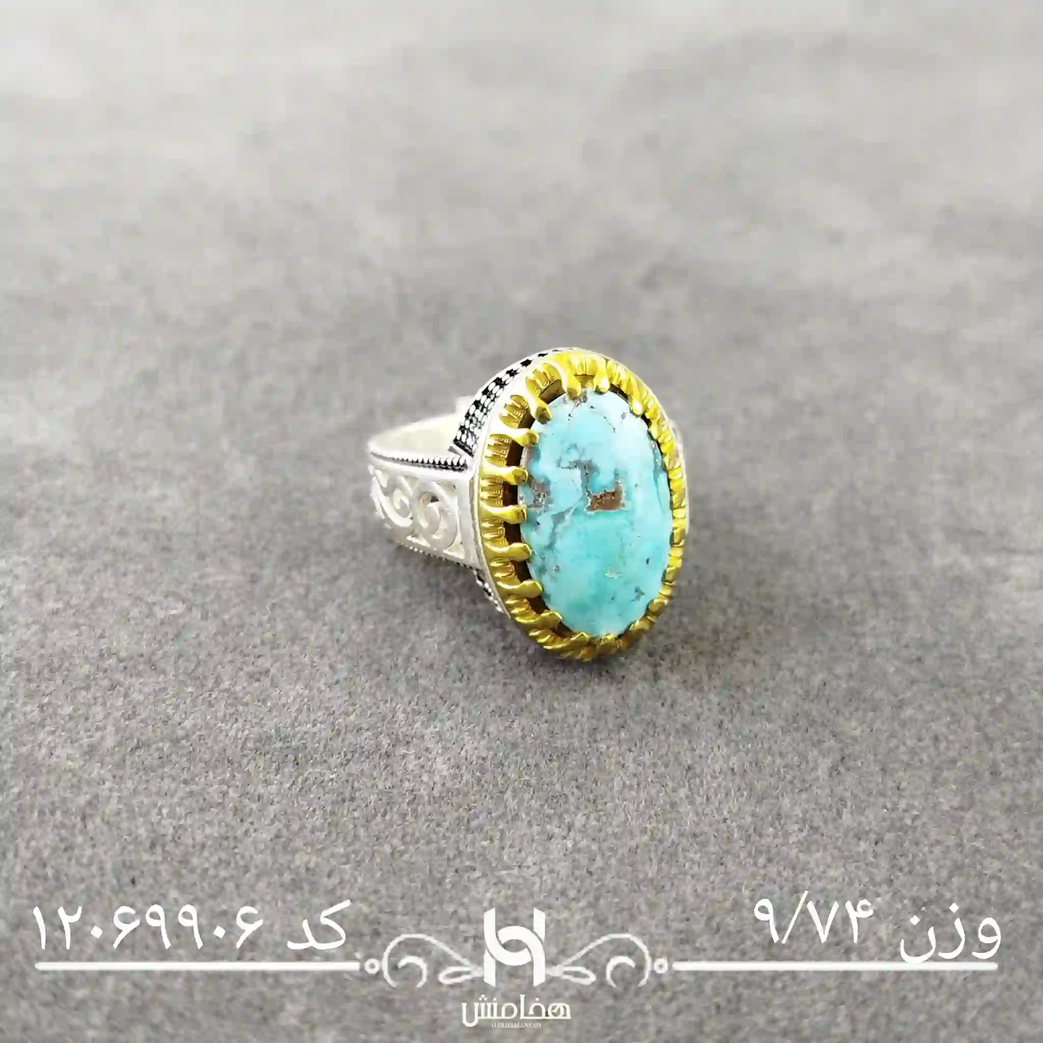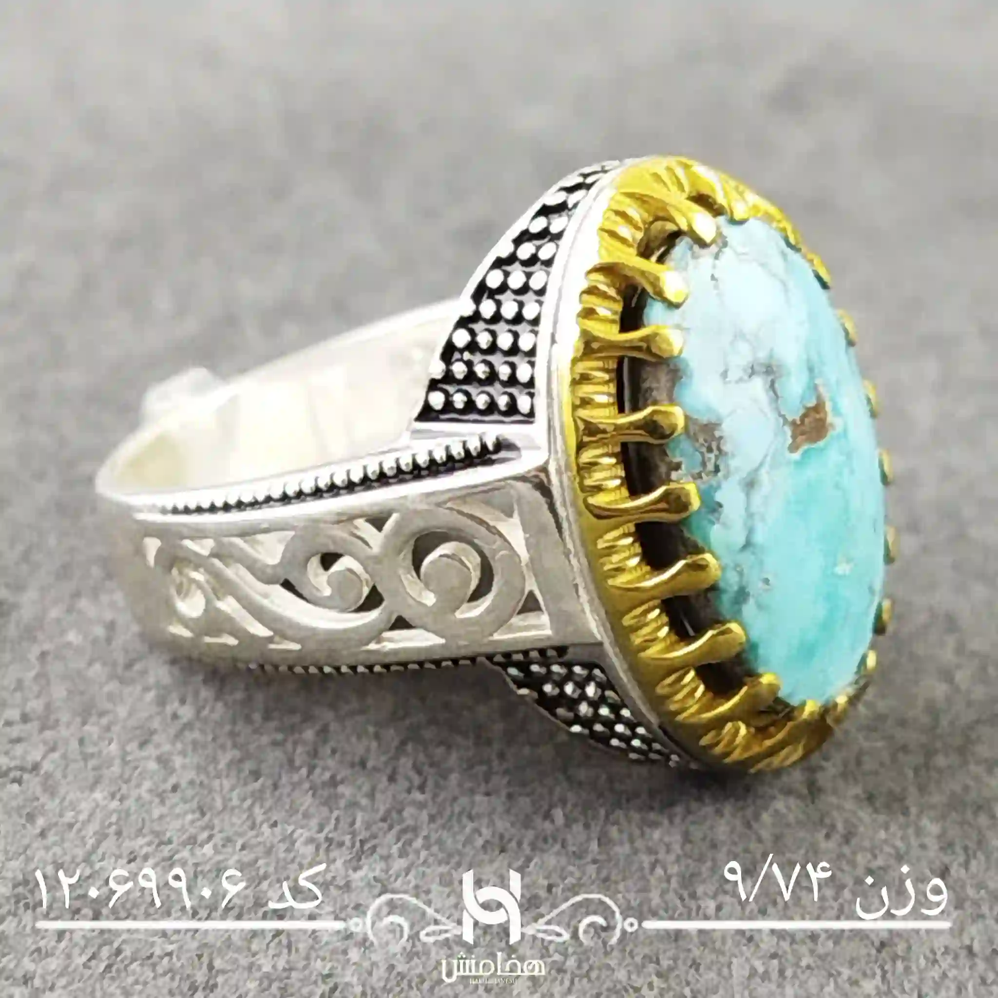 انگشتر نقره مردانه فیروزه دورنگ با سنگ طبیعی اصل و نقره عیار استاندارد 925 تولید شرکت هخامنش میباشد.