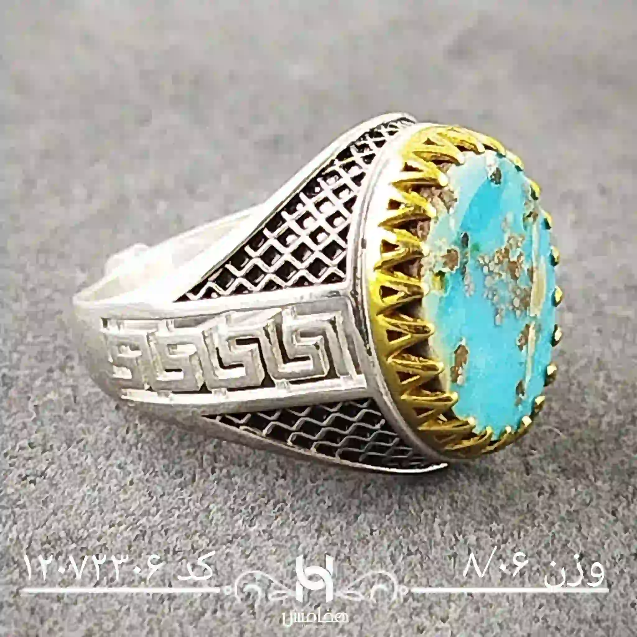 انگشتر نقره مردانه فیروزه دورنگ با سنگ طبیعی اصل و نقره عیار استاندارد 925 تولید شرکت هخامنش میباشد.