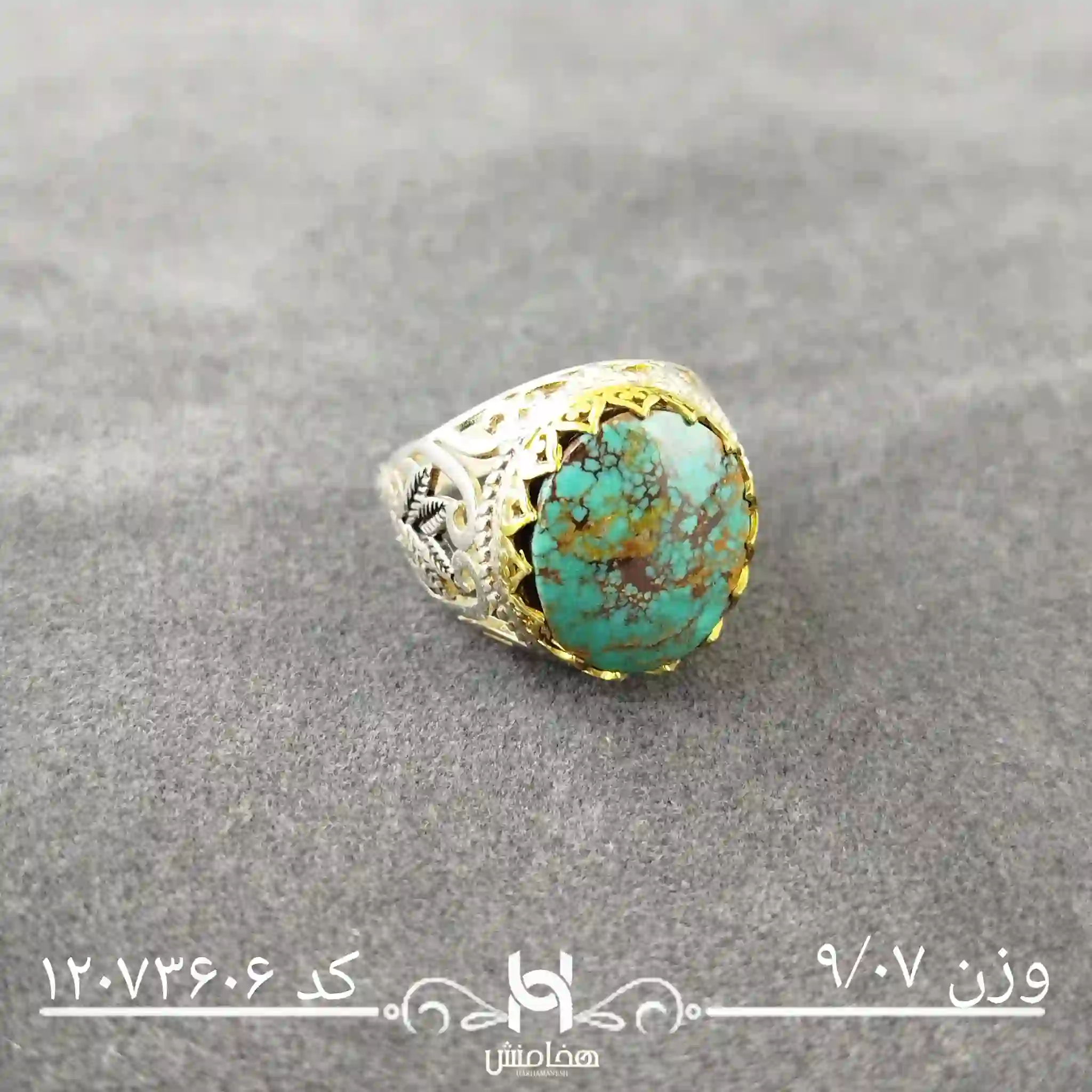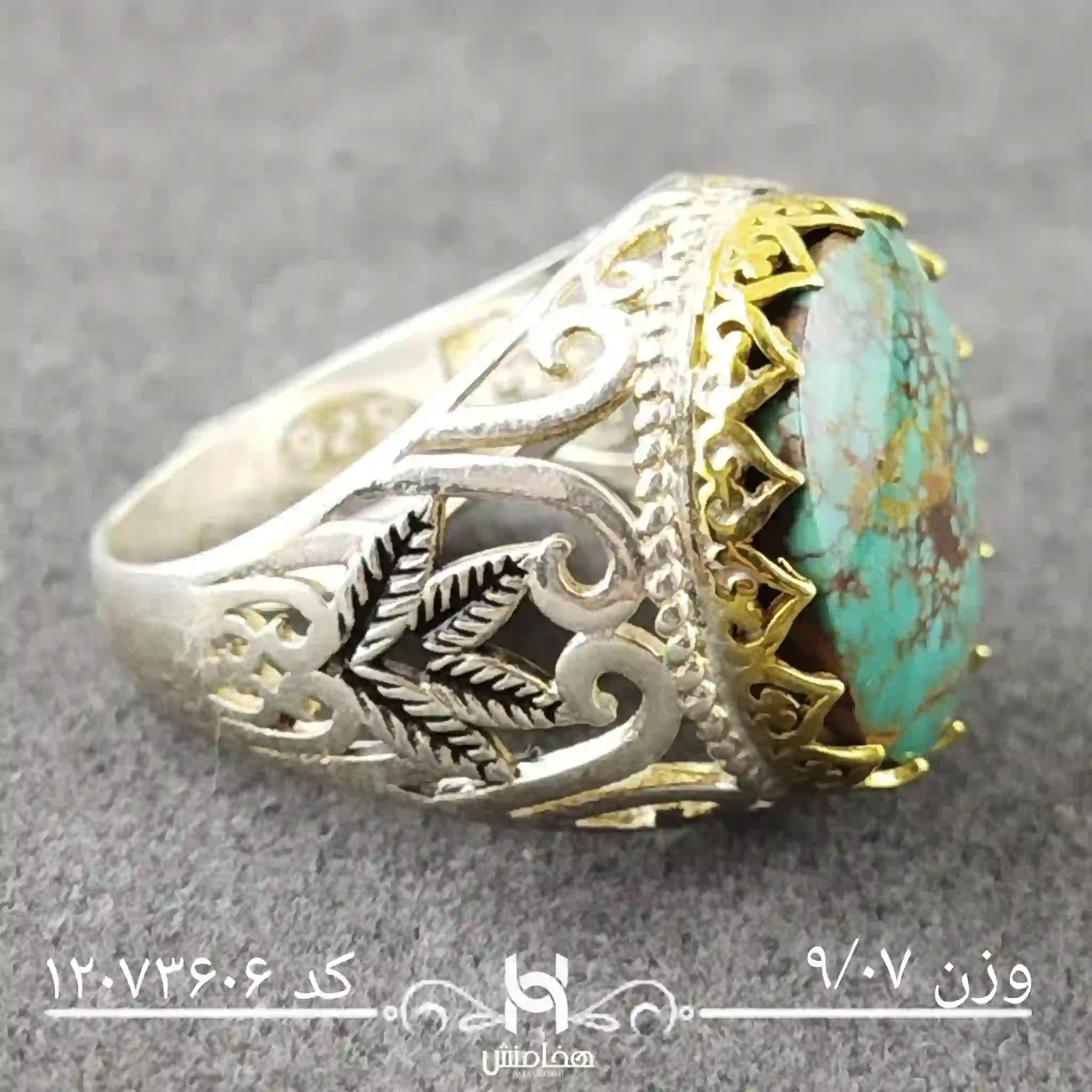 انگشتر نقره مردانه فیروزه دورنگ با سنگ طبیعی اصل و نقره عیار استاندارد 925 تولید شرکت هخامنش میباشد.