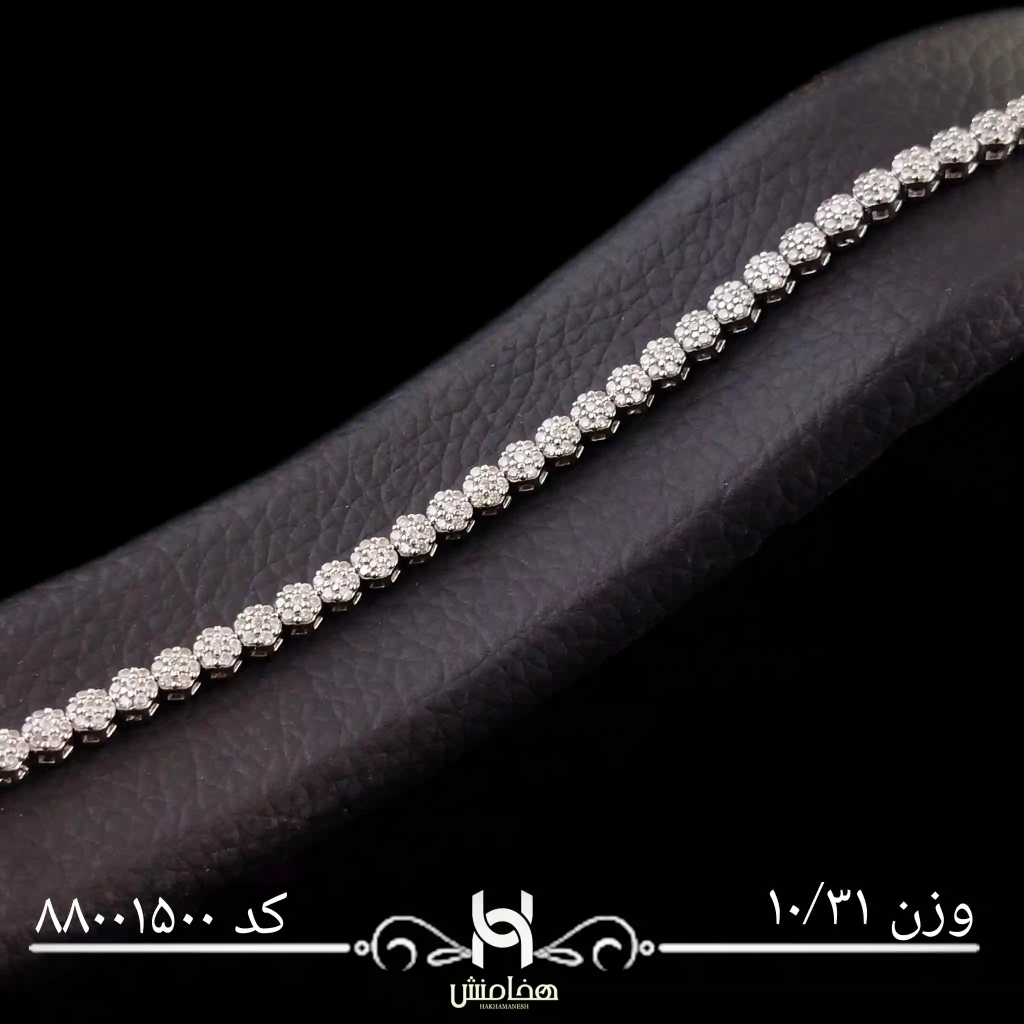 دستبند نقره زنانه رادیوم هخامنش از نقره ۹۲۵ عیار ساخته شده و با نگینهای جواهری باکیفیت بالا تزئین شده است که درخشش خیرهکنندهای مشابه الماس دارند.