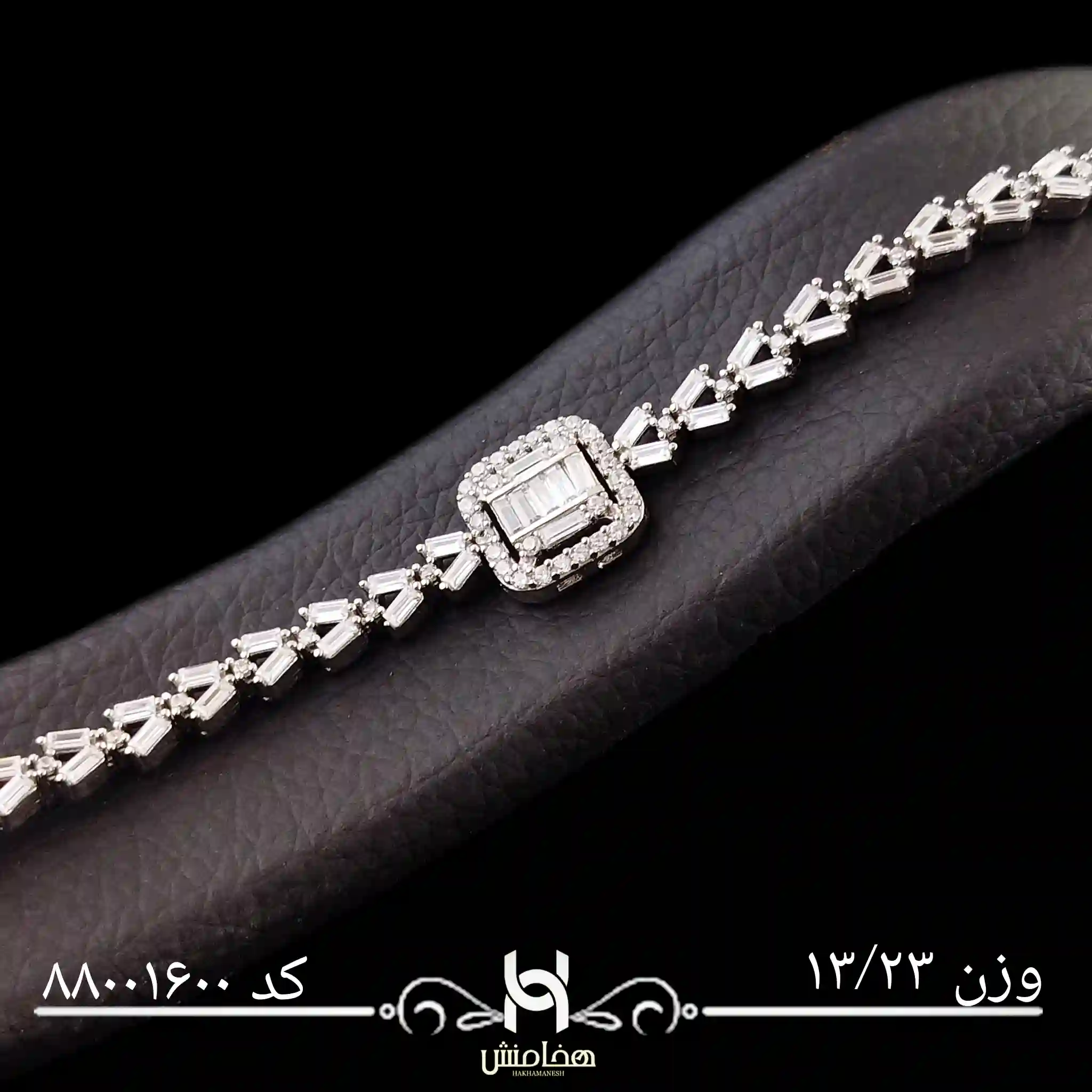 دستبند نقره زنانه رادیوم هخامنش از نقره ۹۲۵ عیار ساخته شده و با نگینهای جواهری باکیفیت بالا تزئین شده است که درخشش خیرهکنندهای مشابه الماس دارند.