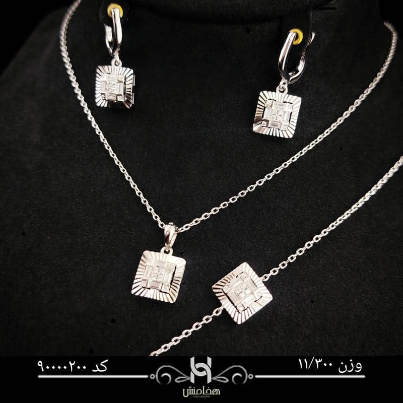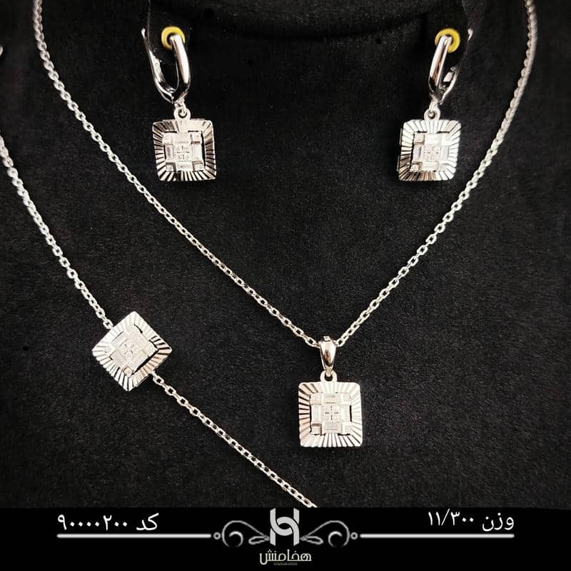 این ست نقره با الهام از طرحهای لوکس اروپایی ساخته شده و با نگینهای ریز و درخشان خود، در نور محیط جلوهای چشمگیر دارد. گردنبند دارای آویز مستطیلی نگیندار است که در مرکز توجه قرار میگیرد، و گوشوارهها با طراحی هماهنگ و ظریف، به زیبایی چهره میافزایند.