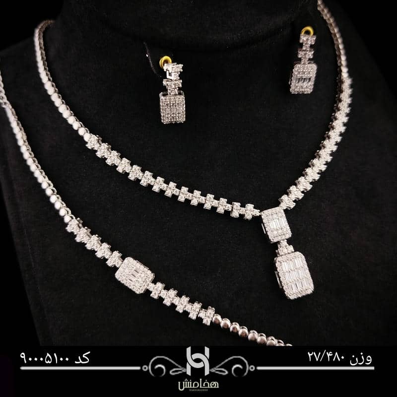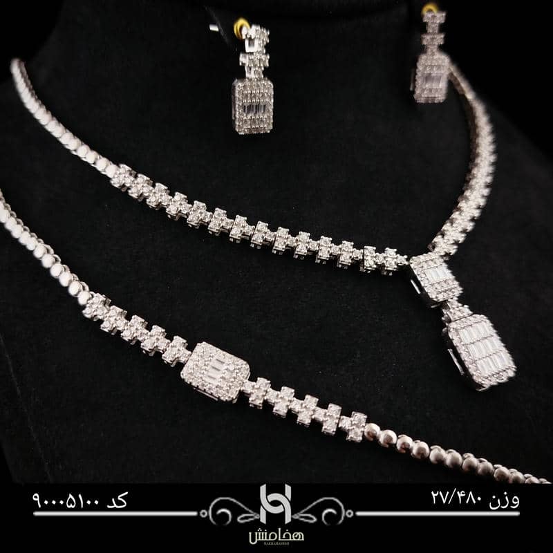 این ست نقره با الهام از طرحهای لوکس اروپایی ساخته شده و با نگینهای ریز و درخشان خود، در نور محیط جلوهای چشمگیر دارد. گردنبند دارای آویز مستطیلی نگیندار است که در مرکز توجه قرار میگیرد، و گوشوارهها با طراحی هماهنگ و ظریف، به زیبایی چهره میافزایند.