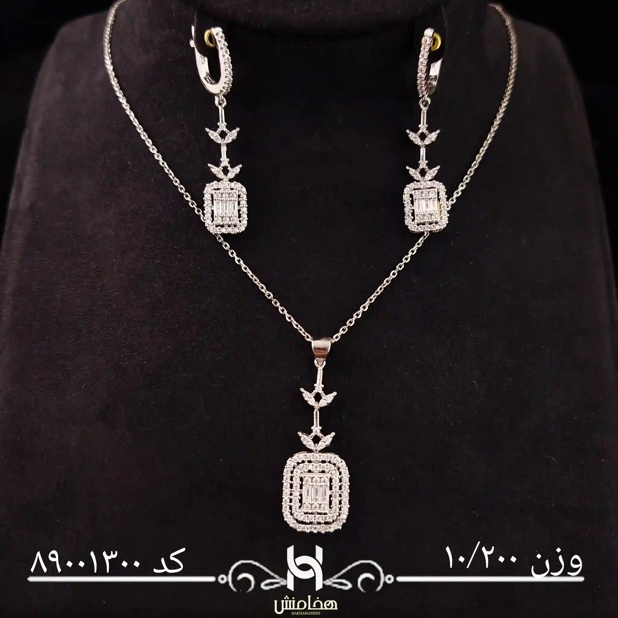 پلاک مرکزی با نگینهای ریز و درخشان زیرکون تزئین شده و در کنار گوشوارههایی با طرح مشابه، ترکیبی از جذابیت و وقار را به نمایش میگذارد.