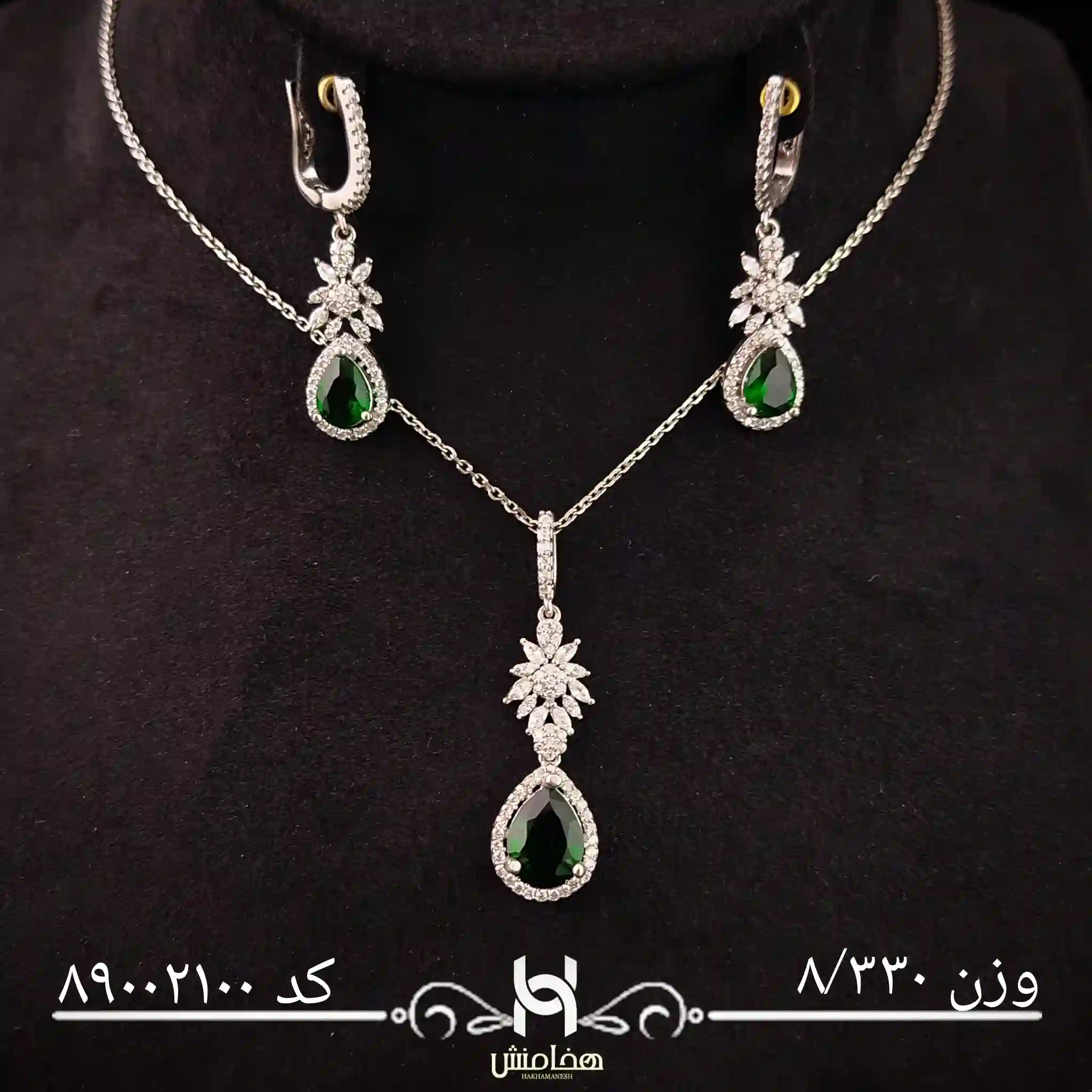 پلاک مرکزی با نگینهای ریز و درخشان زیرکون تزئین شده و در کنار گوشوارههایی با طرح مشابه، ترکیبی از جذابیت و وقار را به نمایش میگذارد.