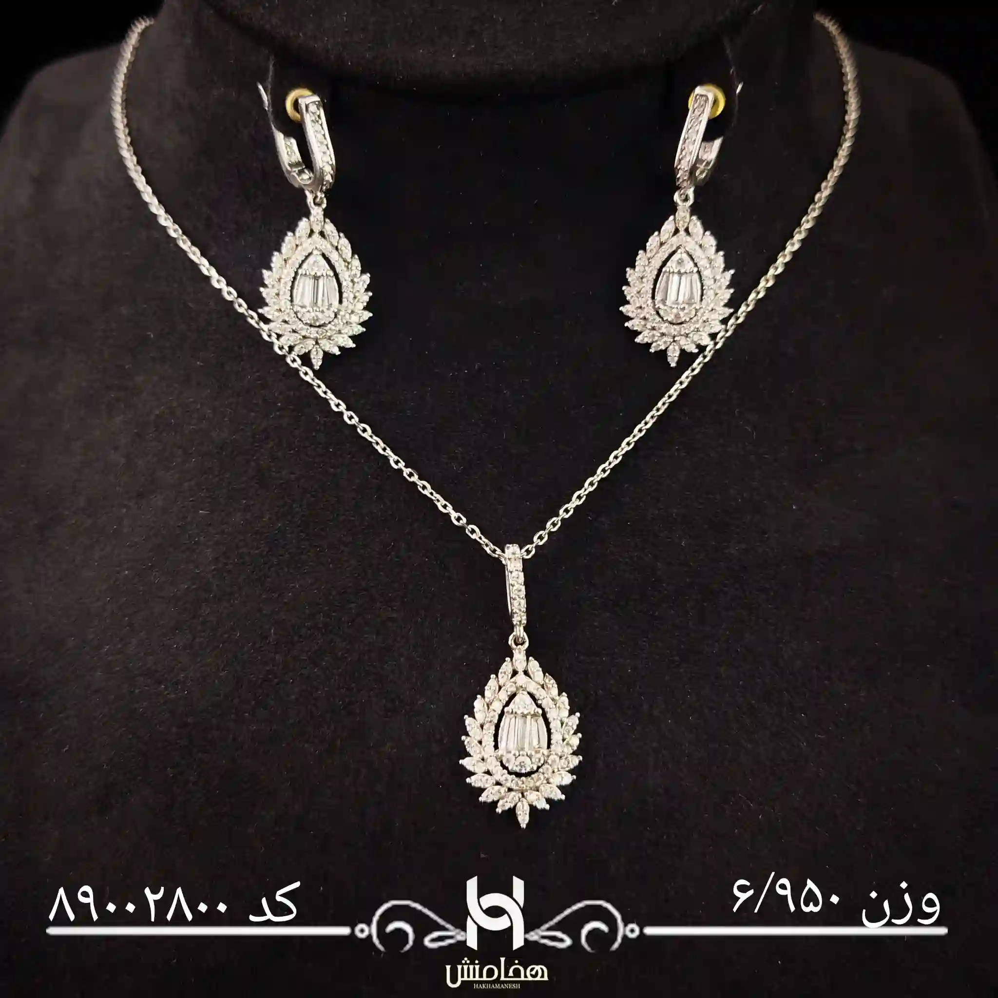 پلاک مرکزی با نگینهای ریز و درخشان زیرکون تزئین شده و در کنار گوشوارههایی با طرح مشابه، ترکیبی از جذابیت و وقار را به نمایش میگذارد.