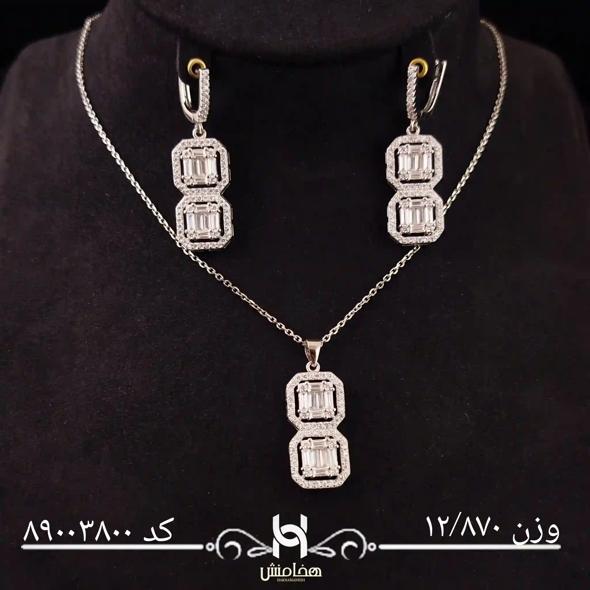 پلاک مرکزی با نگینهای ریز و درخشان زیرکون تزئین شده و در کنار گوشوارههایی با طرح مشابه، ترکیبی از جذابیت و وقار را به نمایش میگذارد.