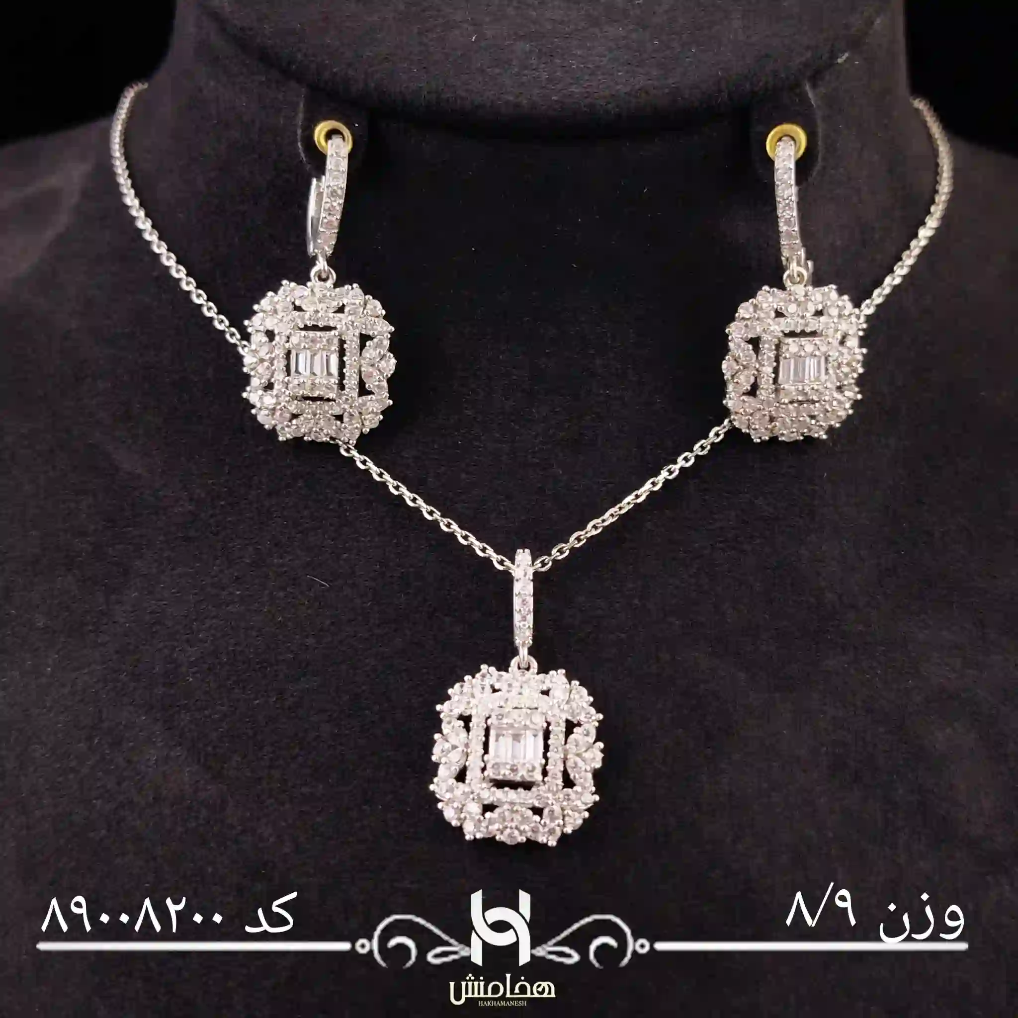 پلاک مرکزی با نگینهای ریز و درخشان زیرکون تزئین شده و در کنار گوشوارههایی با طرح مشابه، ترکیبی از جذابیت و وقار را به نمایش میگذارد.