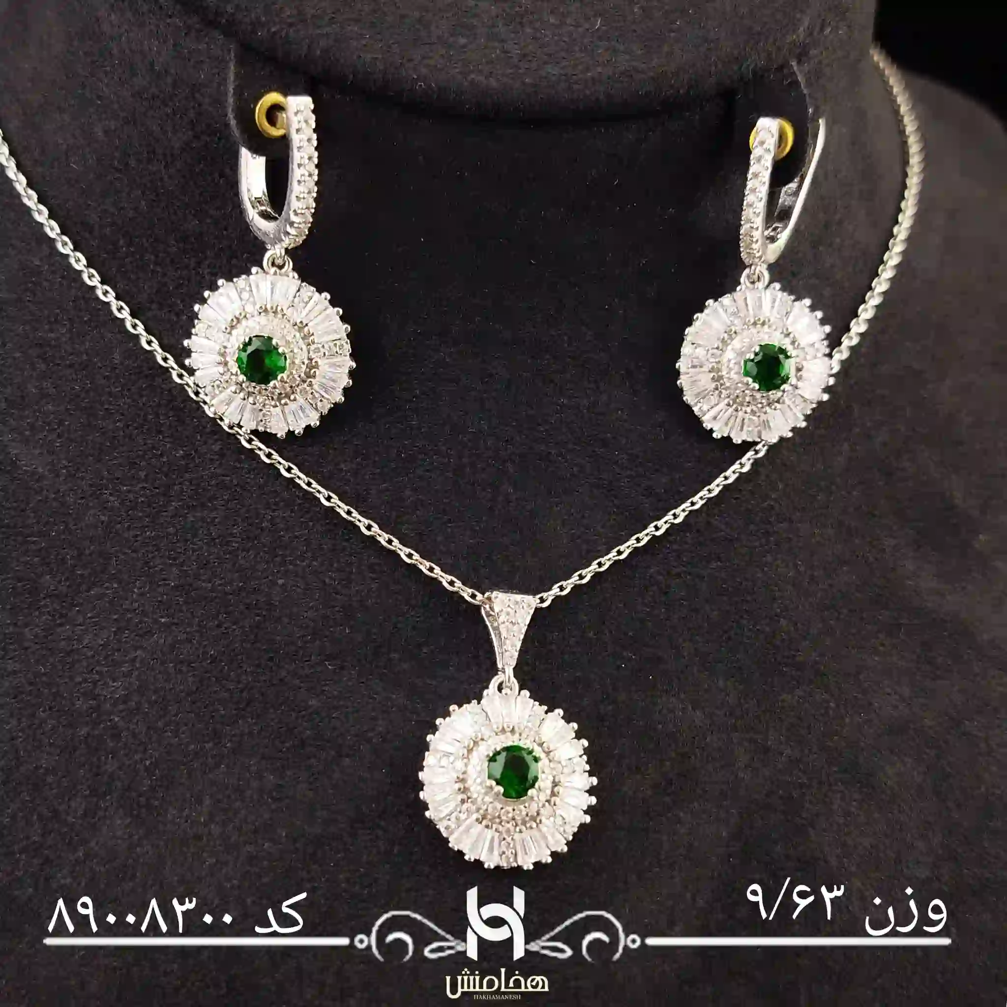 پلاک مرکزی با نگینهای ریز و درخشان زیرکون تزئین شده و در کنار گوشوارههایی با طرح مشابه، ترکیبی از جذابیت و وقار را به نمایش میگذارد.